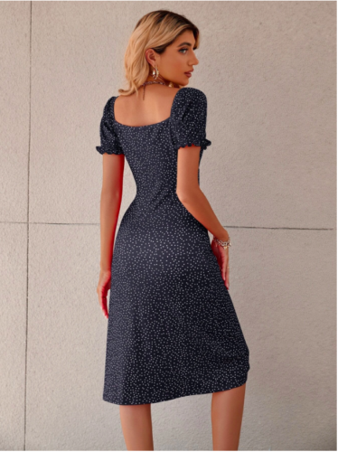 Black VCAY Polka Dot Puff Sleeve Tie Front Ruched Bust Slit Hem DressSz XS S M L