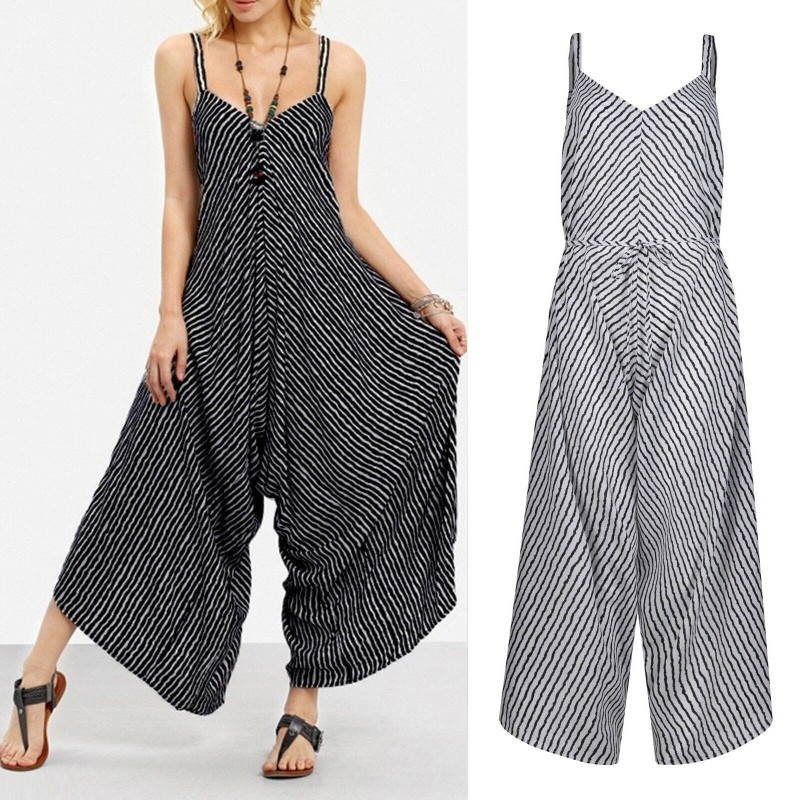 Women's Striped Printed Suspenders Loose One-piece Wide Leg Pants Jumpsuit